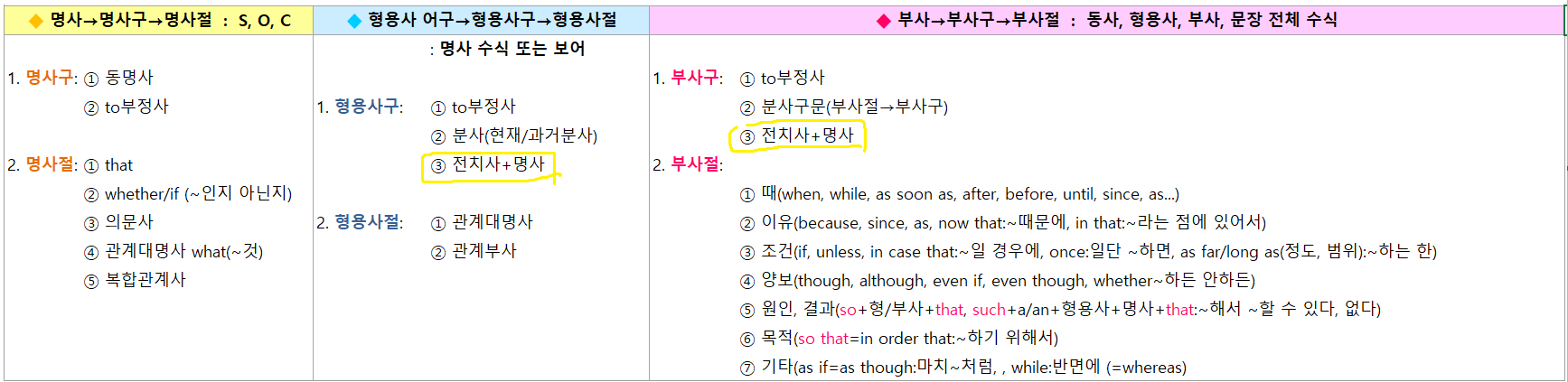 위 도표에서 노란 펜으로 표시되어 있는 '전치사+명사', 속칭 '전명구 (prepositional phrase)'에 주목하자.