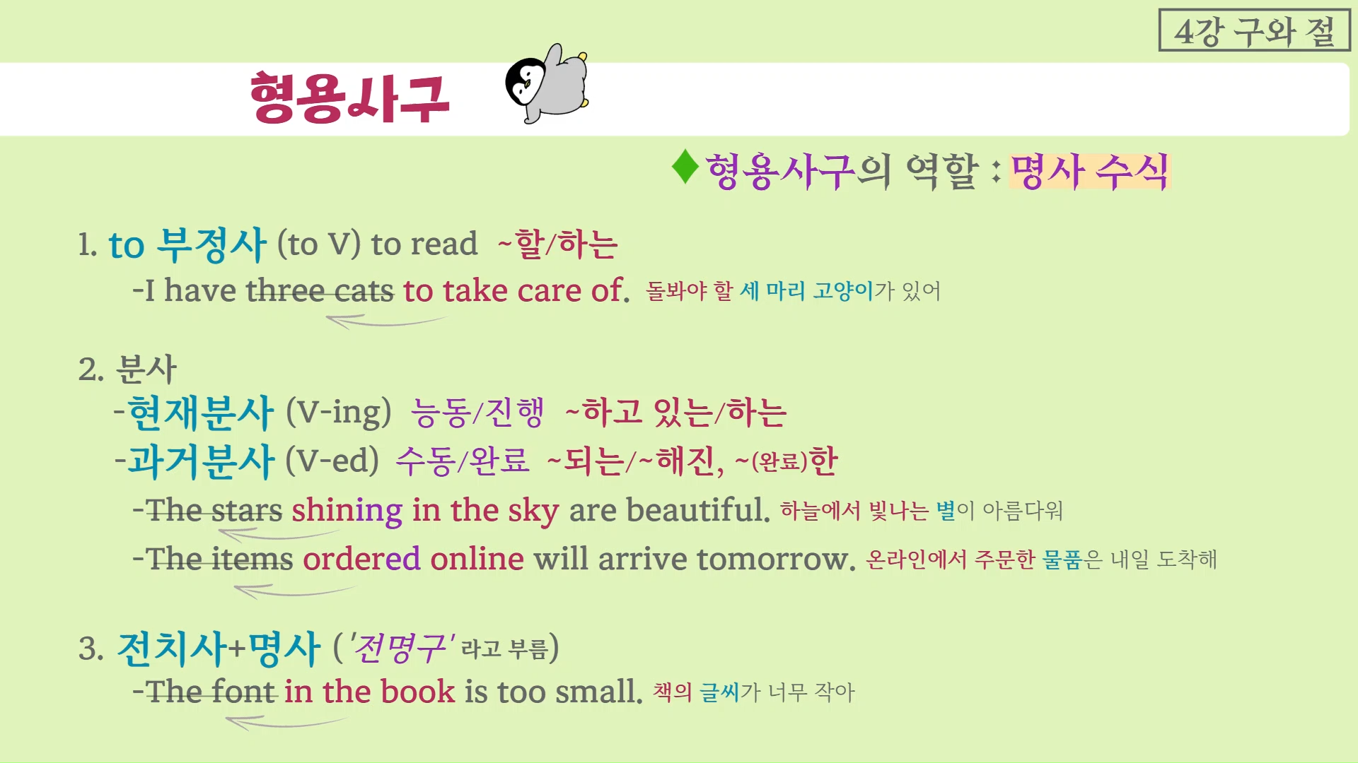 4. 전치사+명사 (전명구) : 형용사구, 부사구