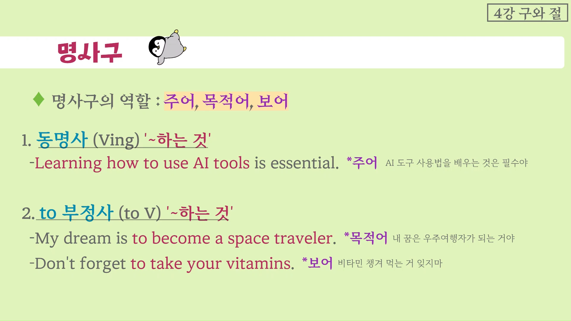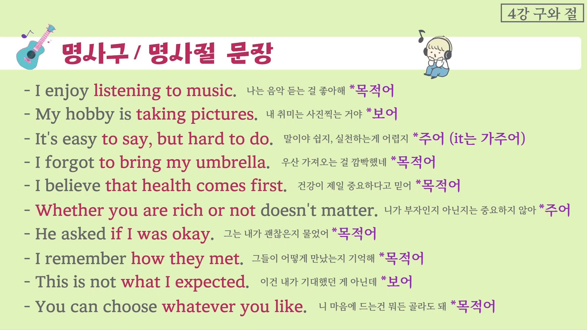 자 그럼 명사구와 절을 예문으로 익혀 보겠습니다.