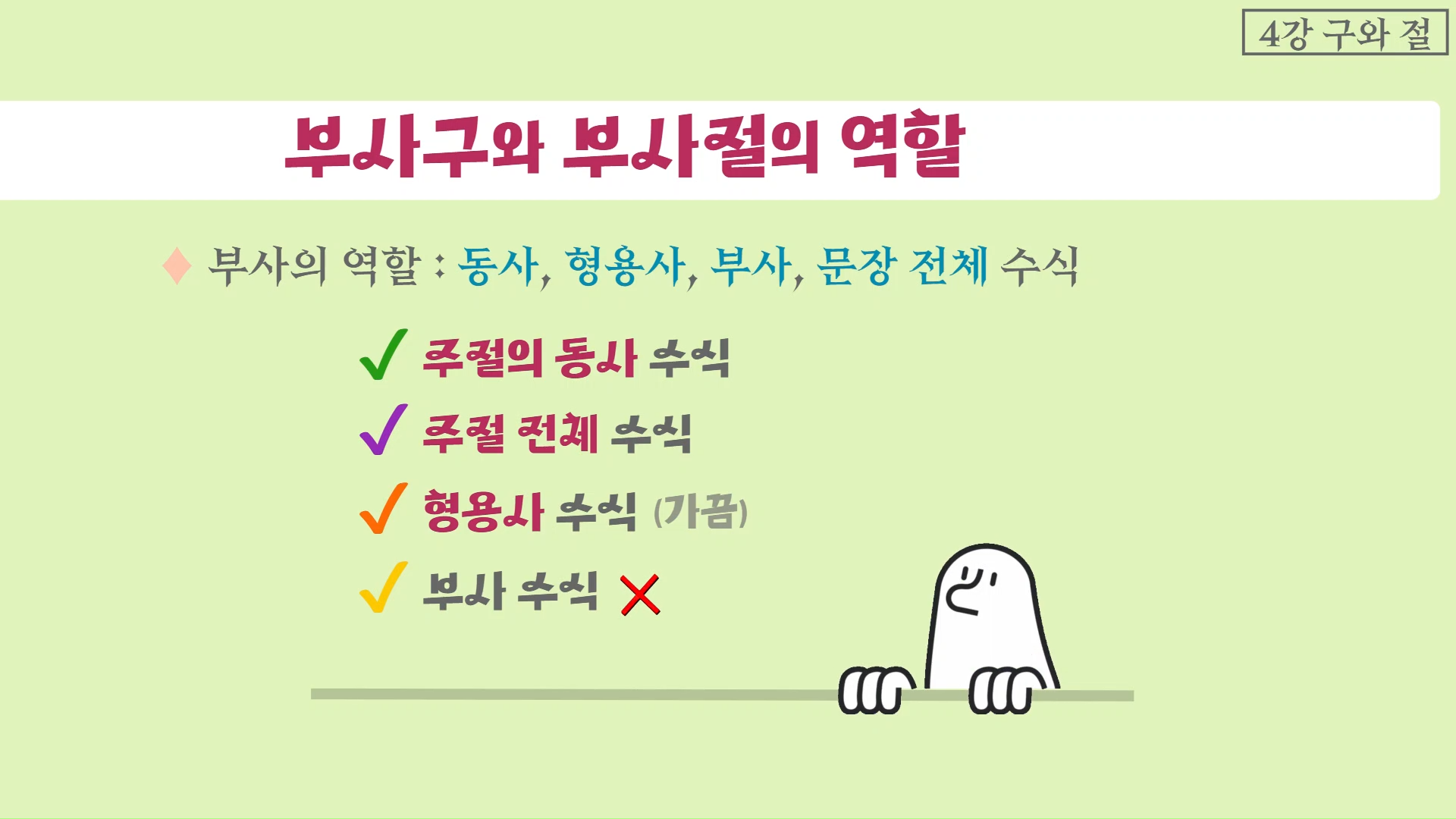 👉🏻 하지만 구와 절로 확장되면 주로 동사나 주절을 수식합니다.