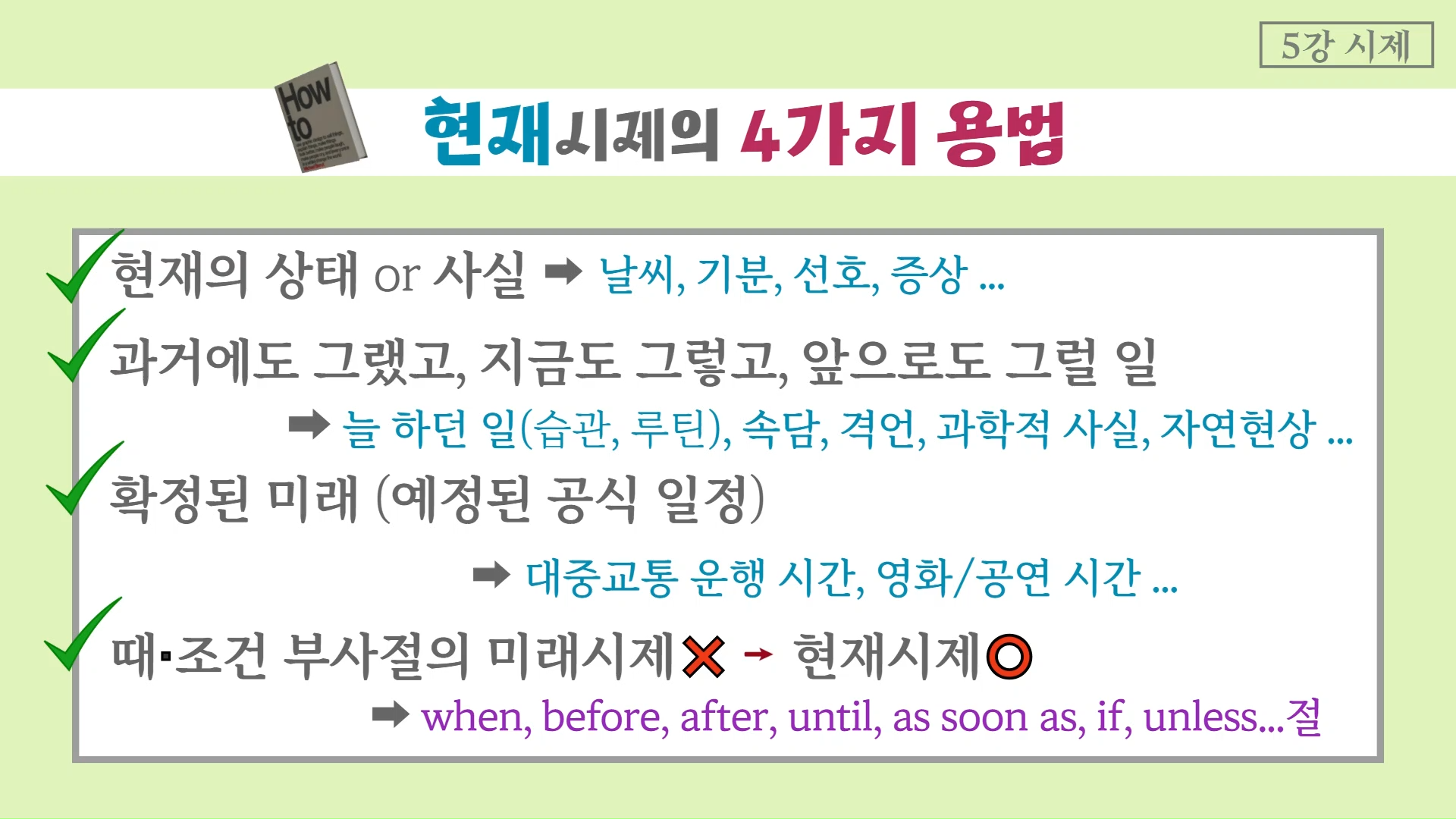 특히 확정된 미래, 그리고 때와 조건의 부사절'에서는 미래 대신 현재를 쓴다는 꿀팁도 꼭 기억하세요!