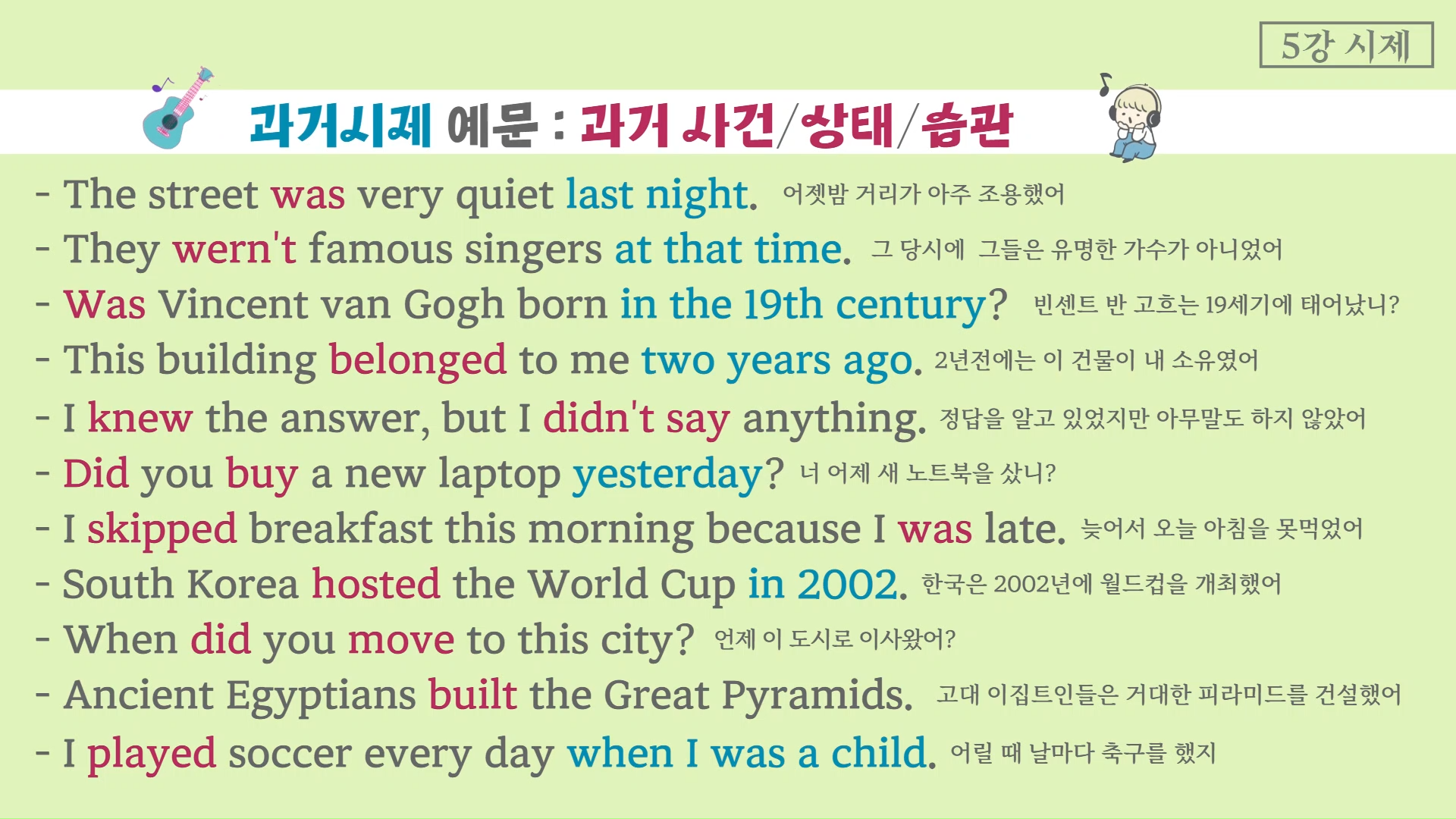 👉🏻 과거 시제와 어울리는 대표적인 표현으로는 yesterday, last night, two hours ago, in 2023, then, at that time, when I was a child... 등이 있답니다.