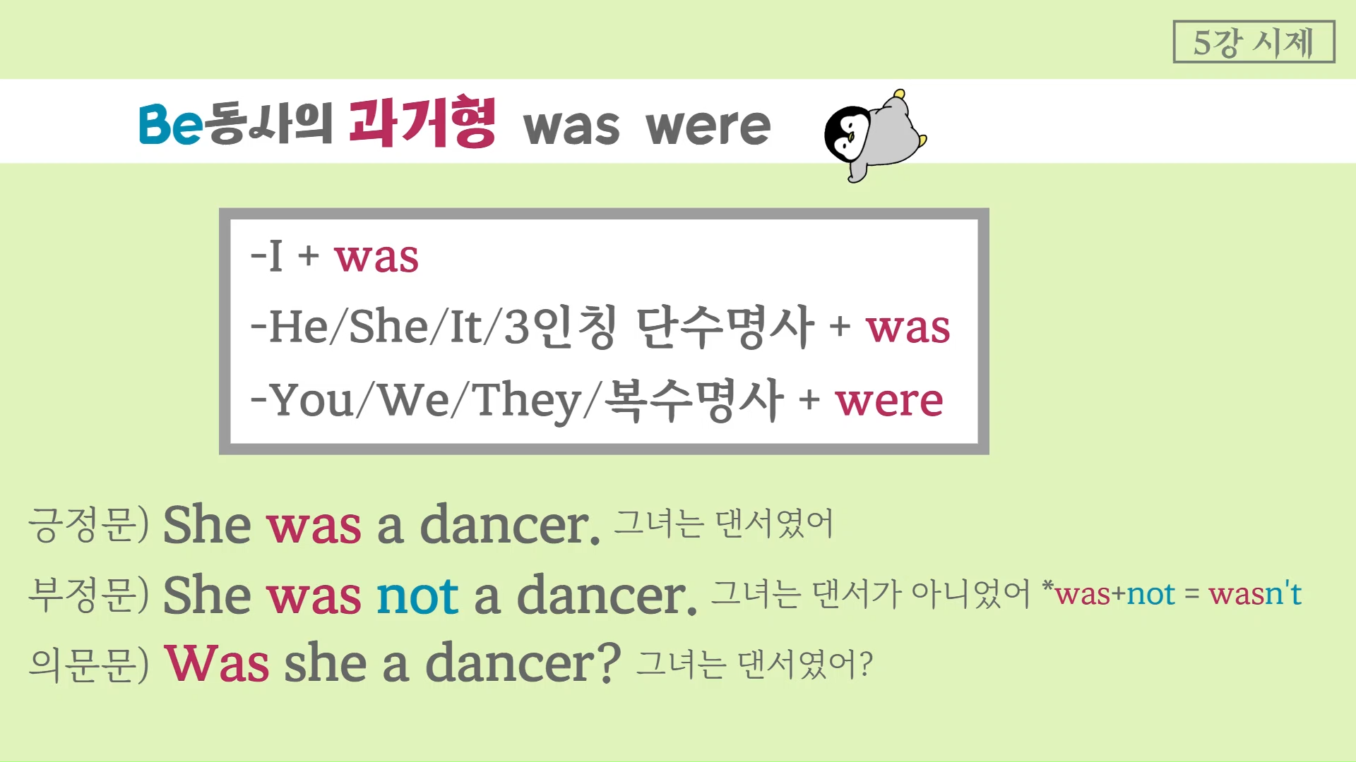 의문문은 'Was she a dancer?'처럼 주어와 Be동사의 위치를 바꾸면 끝!