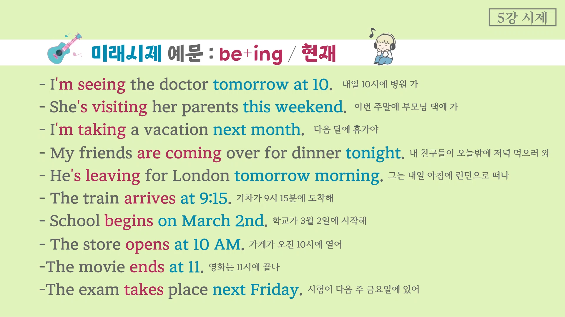 👉🏻 마지막으로 미래 표현은 현재 시제로도 가능한데요. 미리 정해져 있는 스케줄이나 시간표에 따라 이루어지는 확정적인 미래에 어울린답니다.