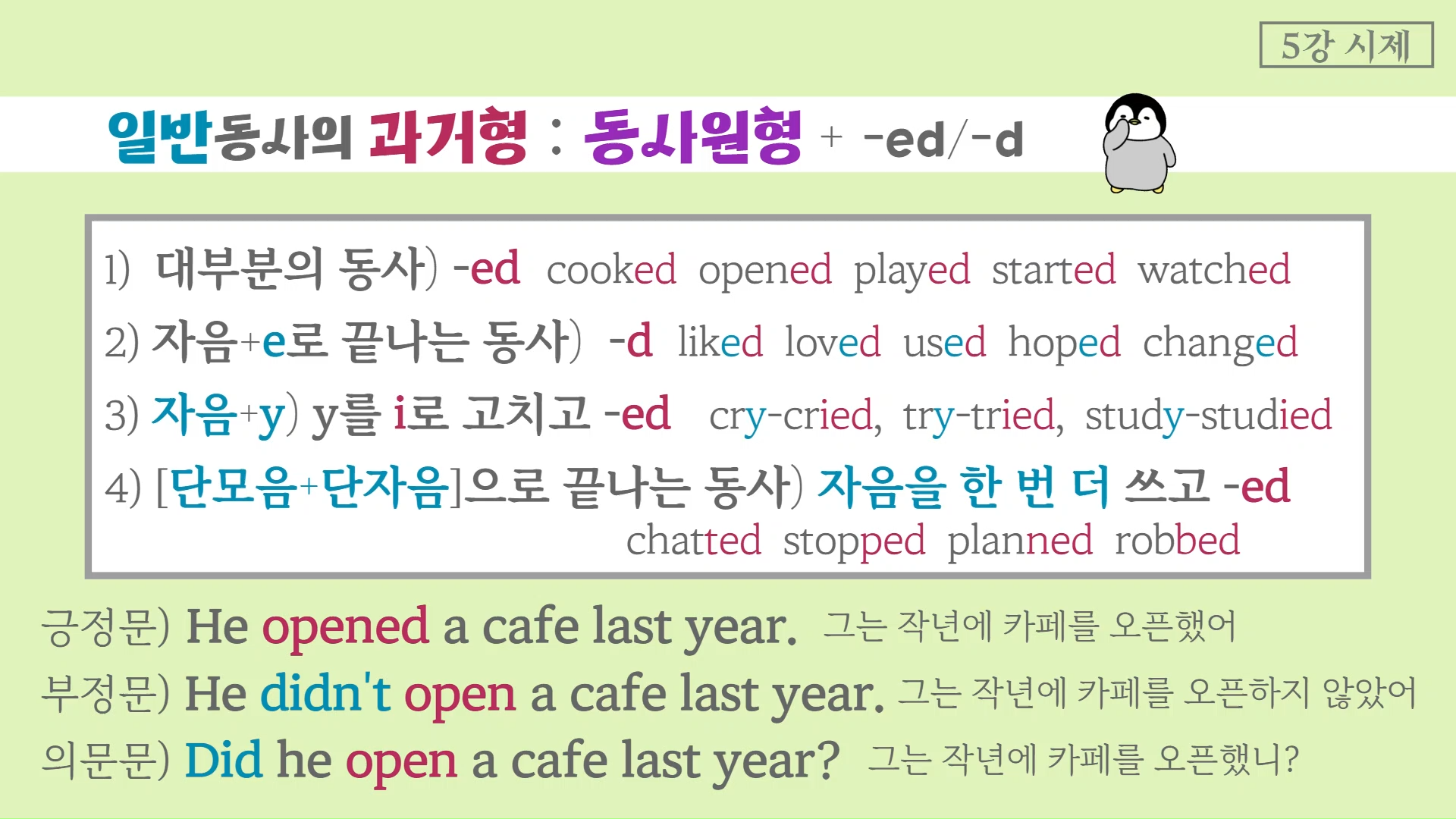 의문문은 'Did he open a cafe last year?'처럼 조동사 Did+주어+동사원형 패턴으로 쓴답니다.