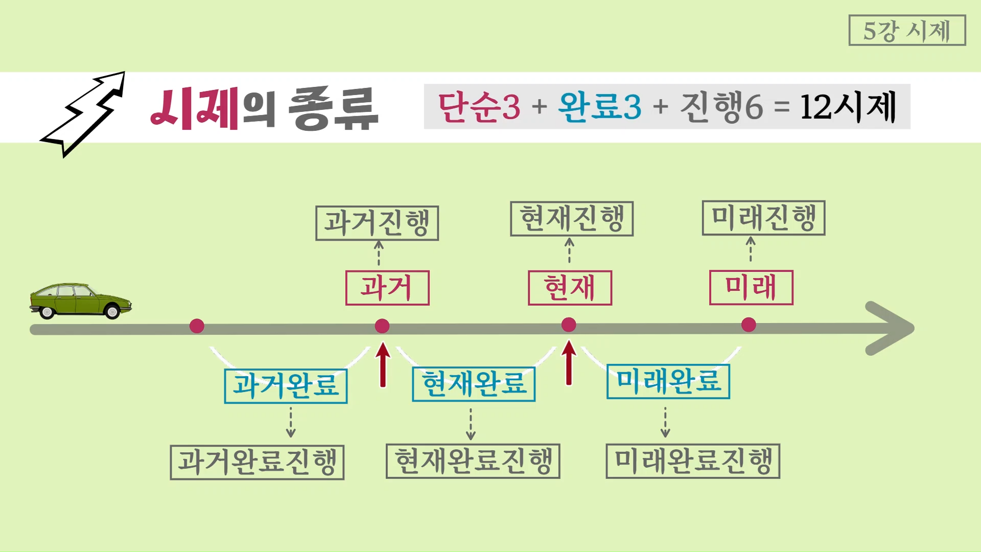 영어는 이 기본 3시제에 완료와 진행을 더해 총 12시제로 좀 더 세분화된 체계를 가지고 있습니다.