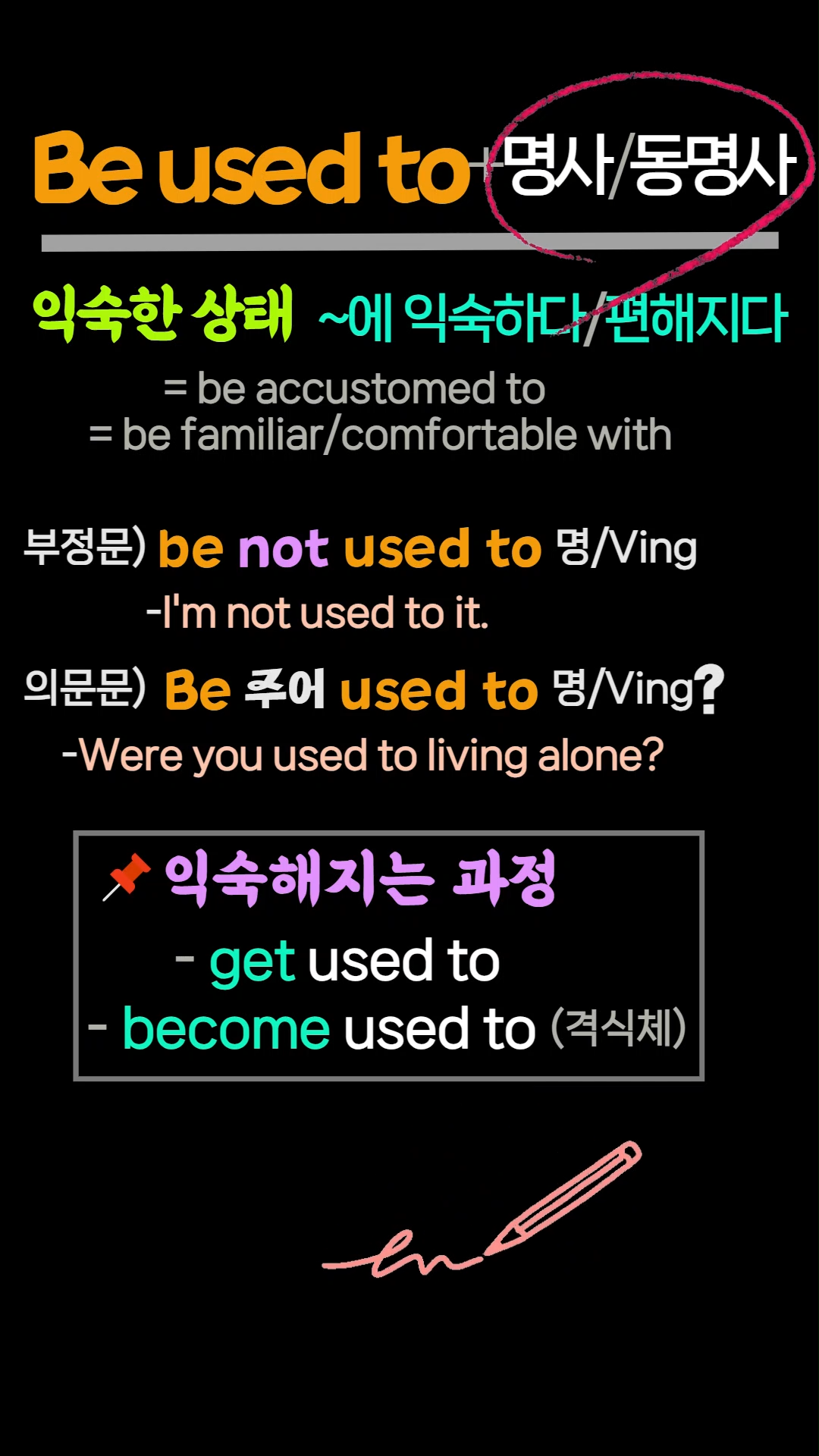 익숙해진 상태가 아닌 과정을 강조하고 싶을 때는 be 대신 get를 써서 get used to를 쓰거나 좀 더 격식체로 become used to를 써야 자연스럽답니다.