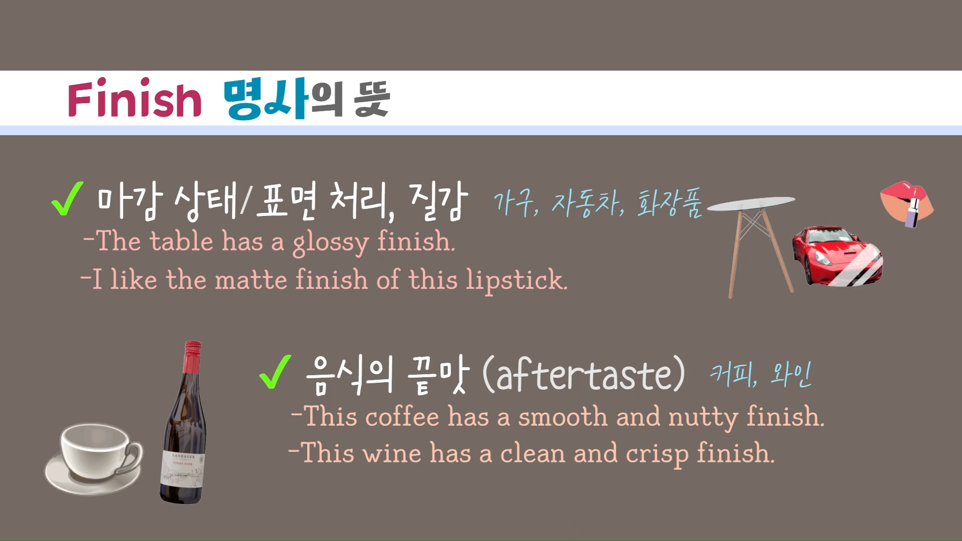 가구, 자동차, 화장품 등의 표면 처리나 질감을 뜻하기도 하고,