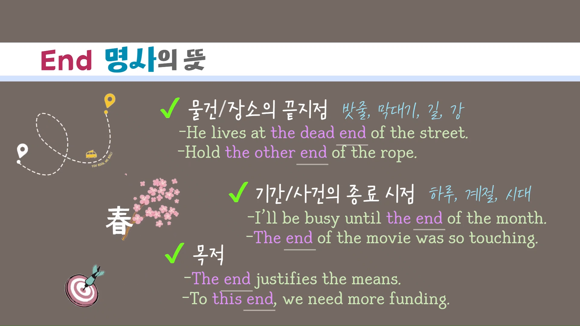 Finish와 마찬가지로 End 또한 명사로 쓰는데요.